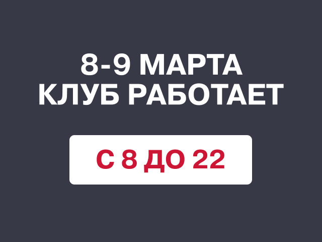 Друзья, наш клуб 8 и 9 марта работает в режиме выходного дня с 8.00 до 22.00!